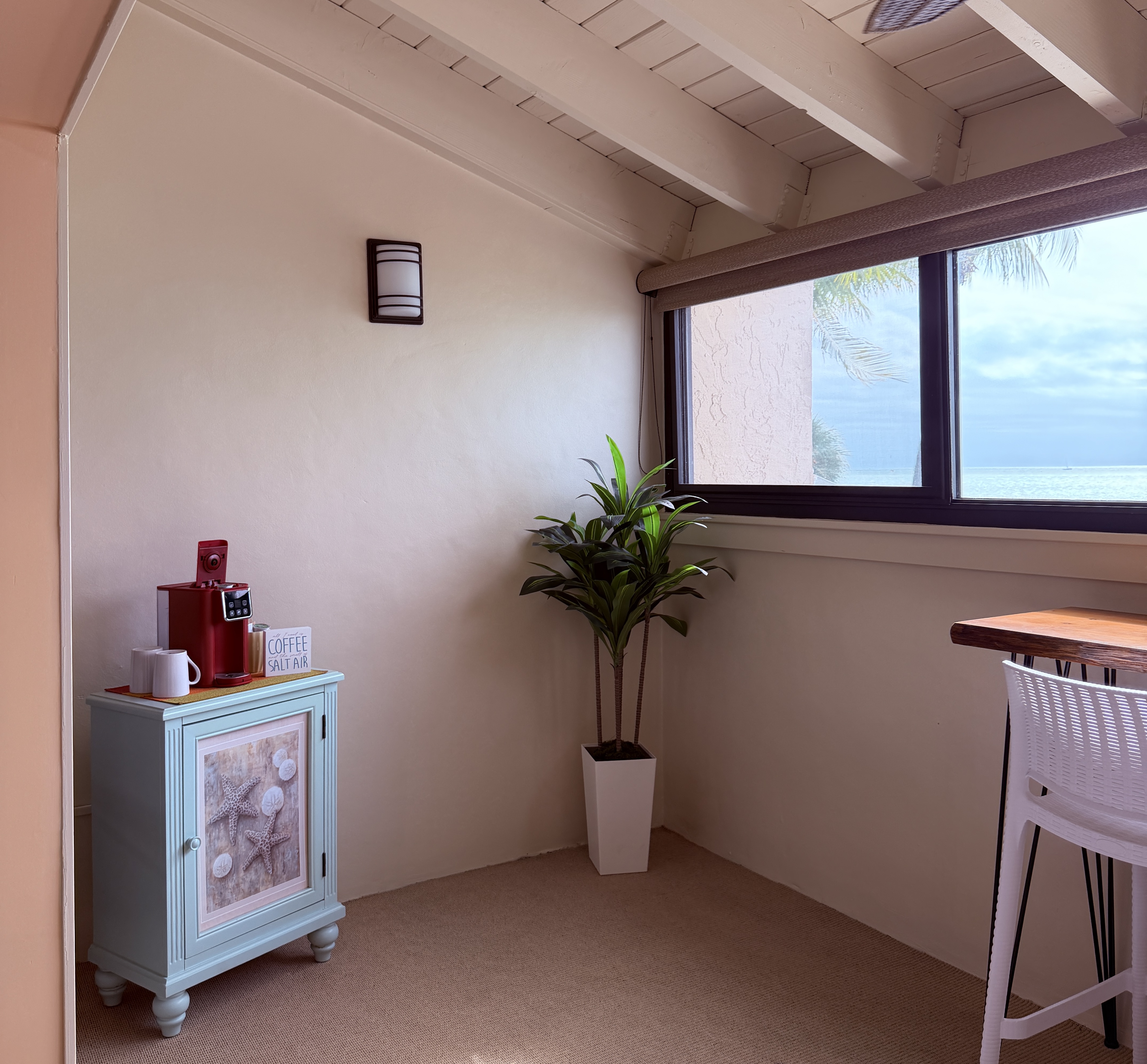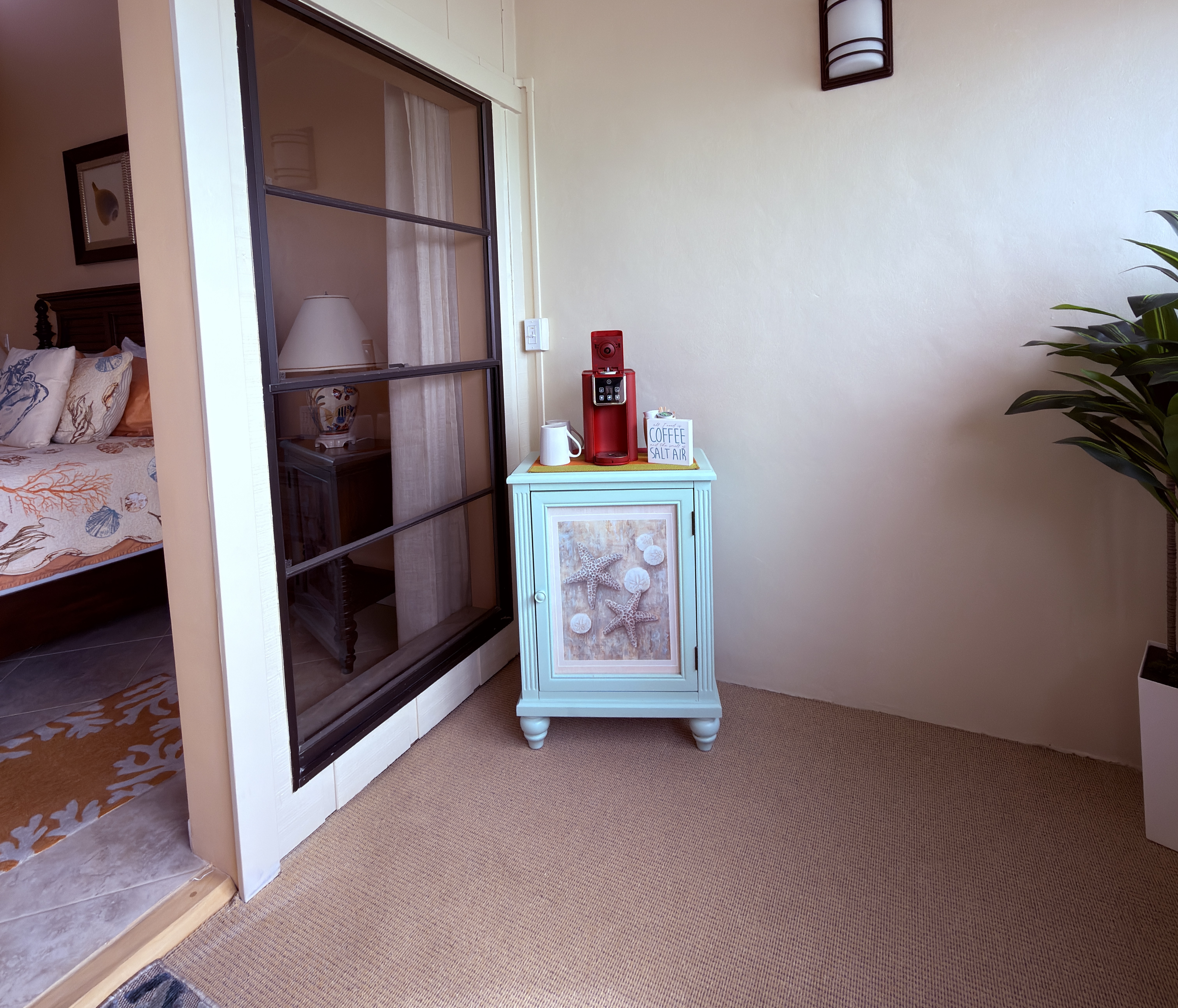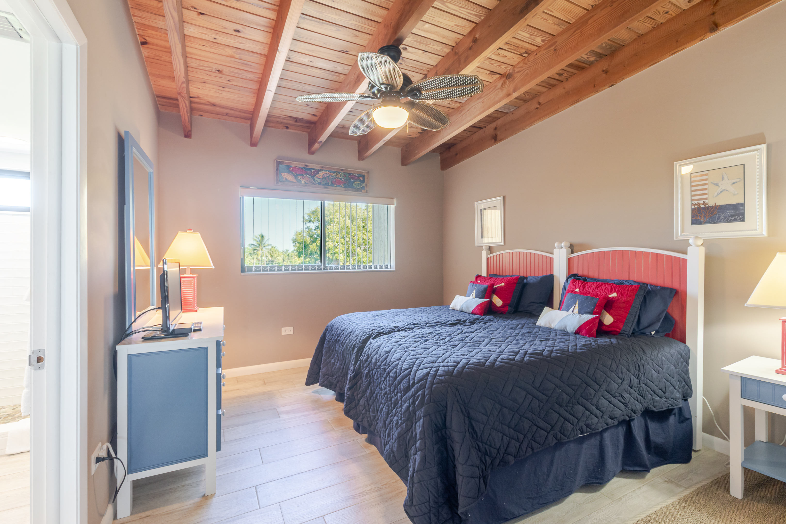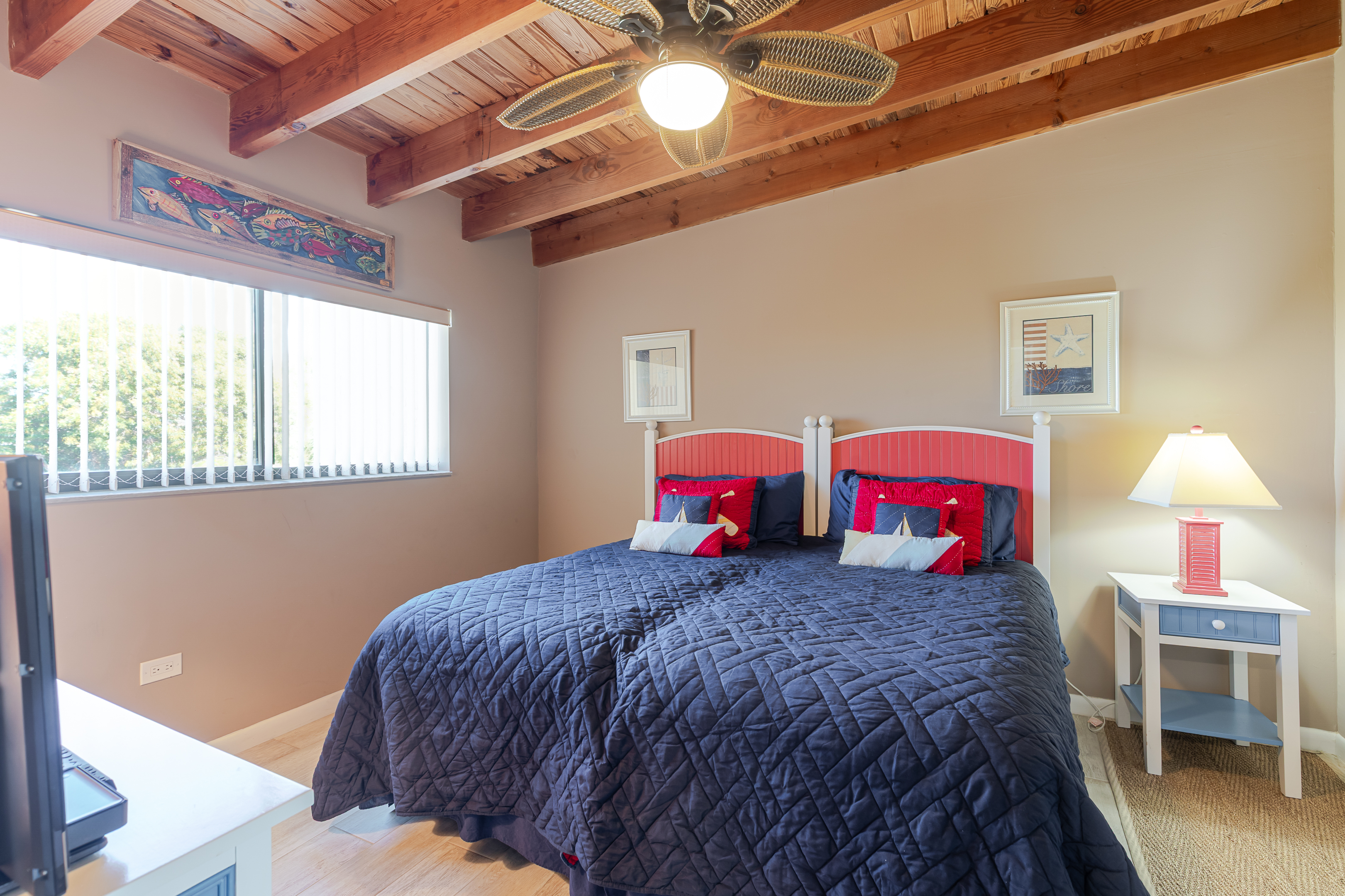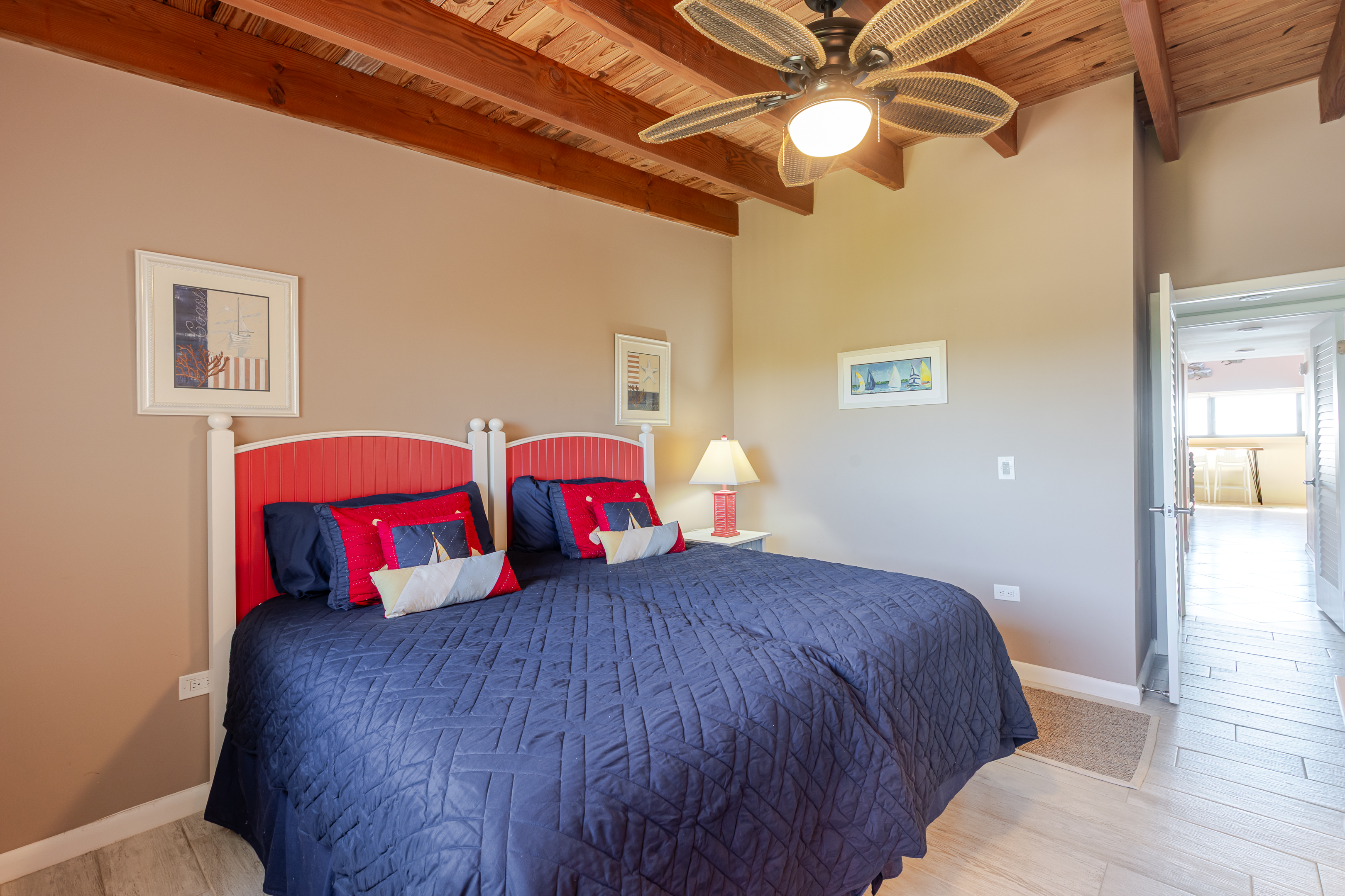 The second floor has a large primary king bedroom and double-vanity bath. There is an additional sunroom off this bedroom overlooking the ocean that can serve as a coffee nook or additional workspace... the feel of a sunny lanai room but with the convenience of A/C! The third bedroom, boasting a balcony overlooking the sports courts, includes its own bathroom and can be set up as a king or twin bed configuration... just let us know what works best for your needs!