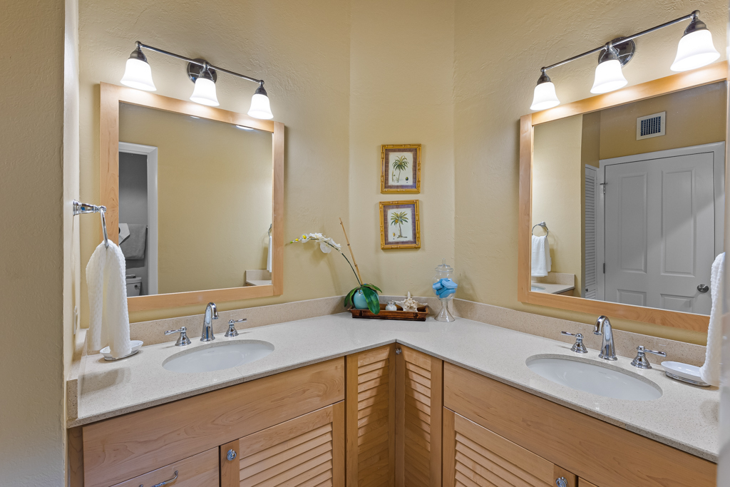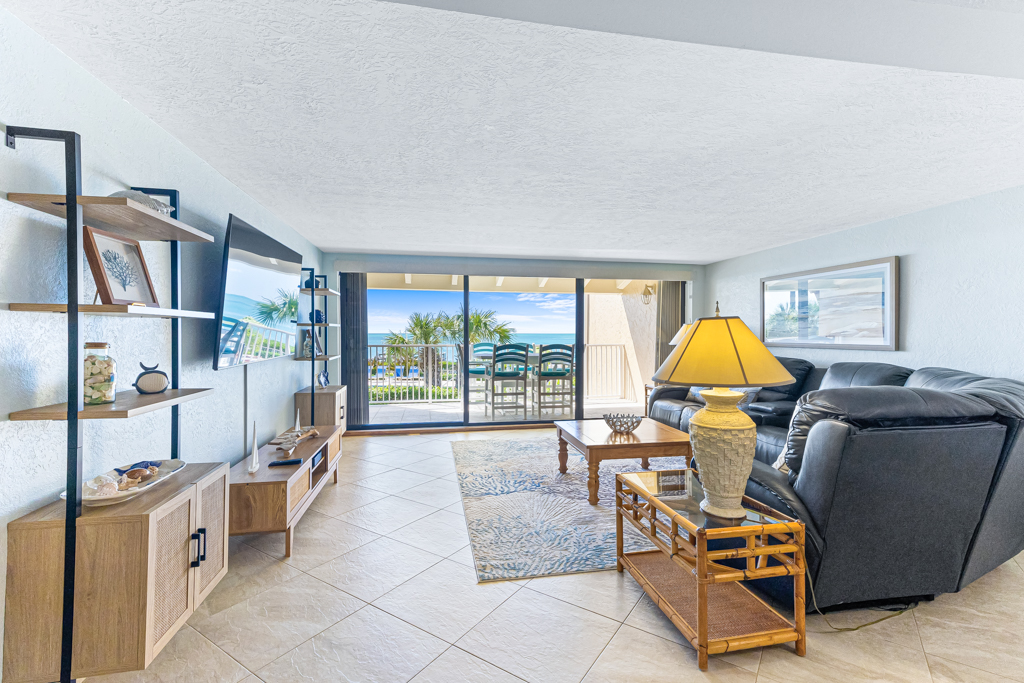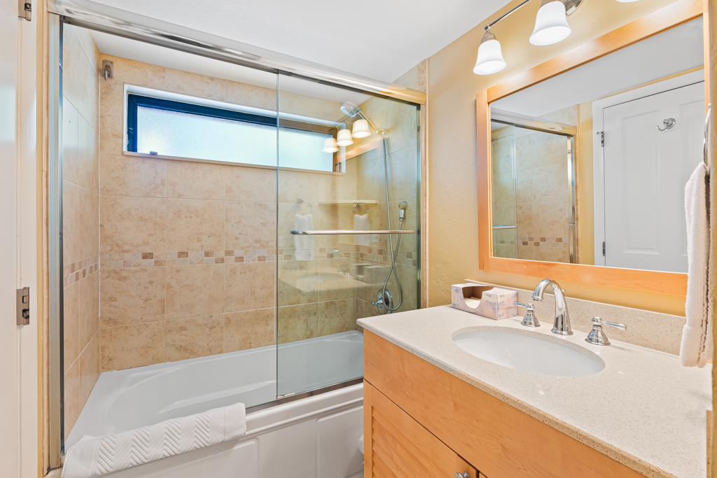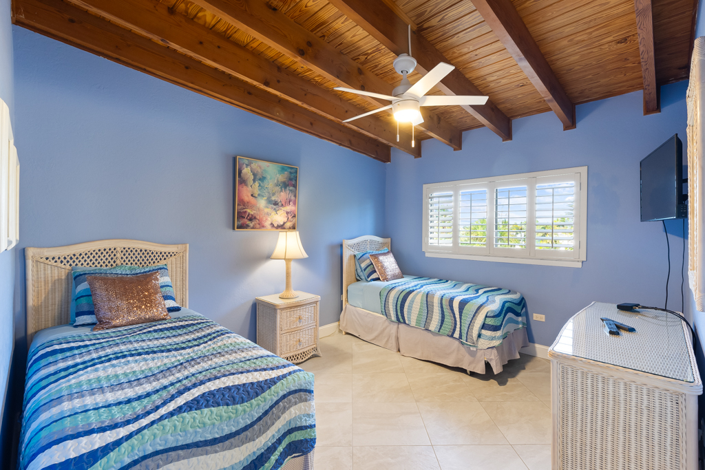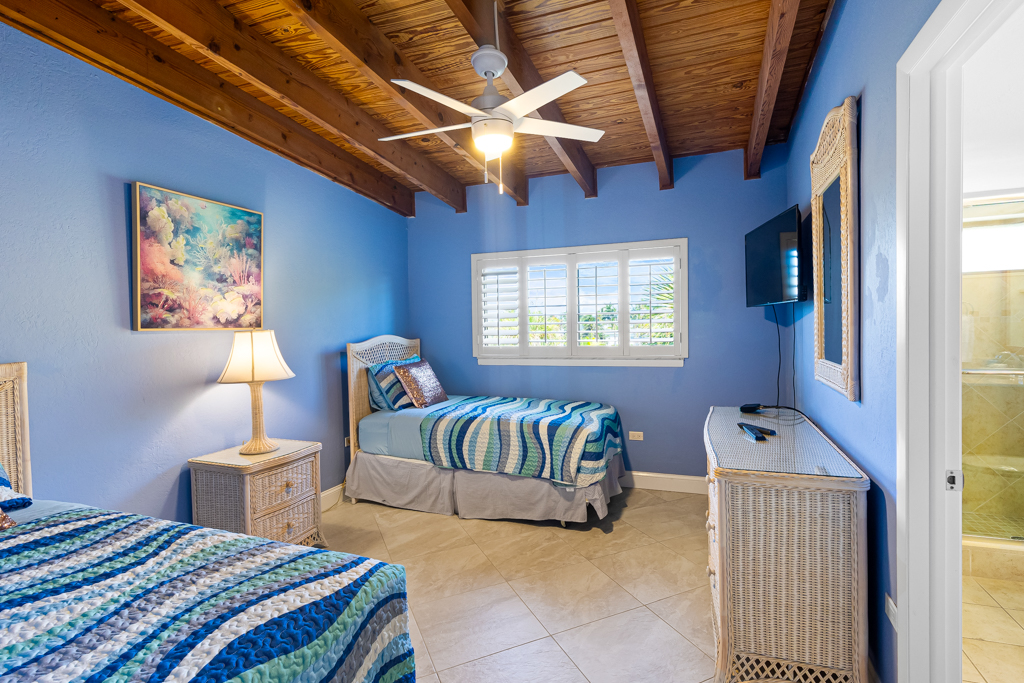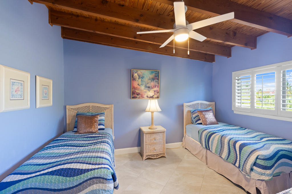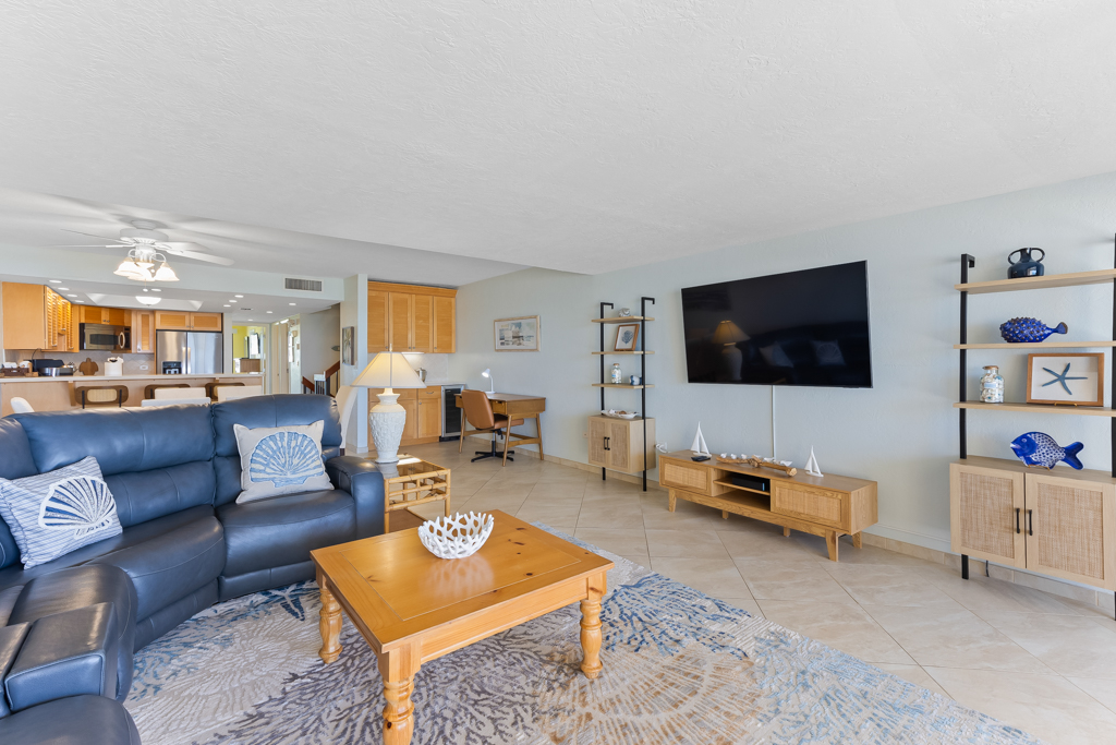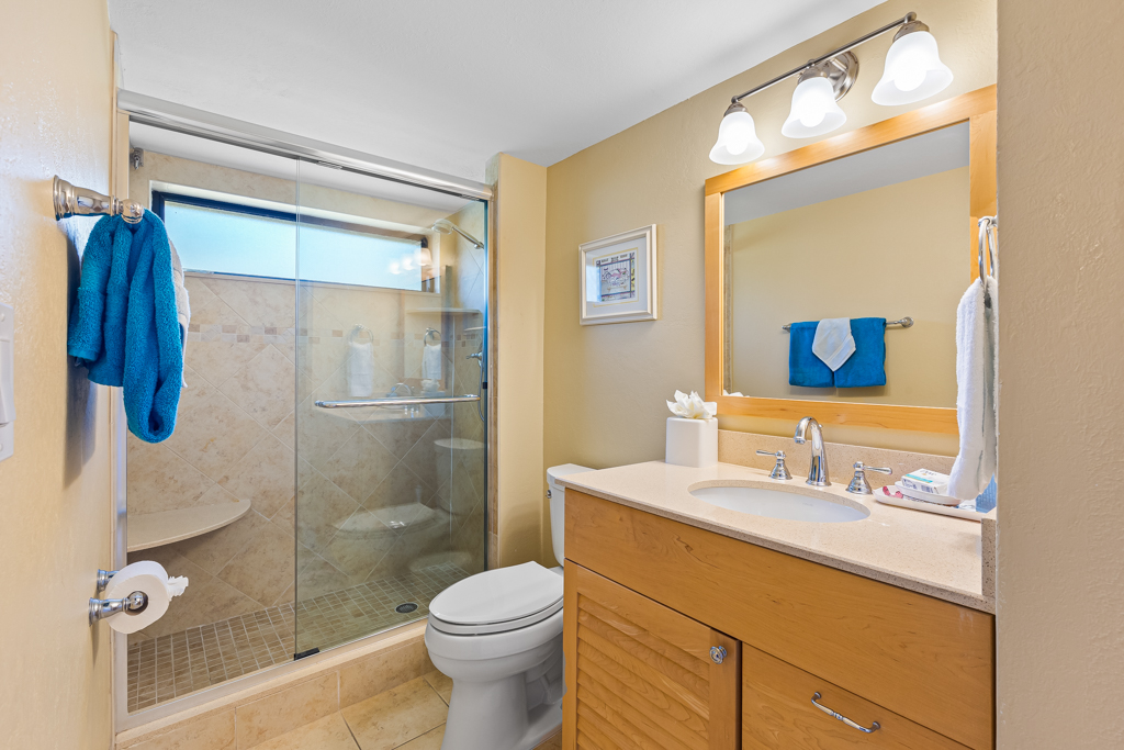 On the main level, you'll find a light and airy living room with a large sectional sofa, ideal for relaxing or enjoying entertainment. The well-equipped kitchen, dining area, work space, laundry, and a guest suite with a queen-sized bed complete the main level. Upstairs, the expansive primary suite offers a king-sized bed, a private oceanfront balcony, and an ensuite bathroom with a walk-in shower, dual vanities, and ample storage. Also on the top floor is the kids' room with two twin beds and a guest bathroom.