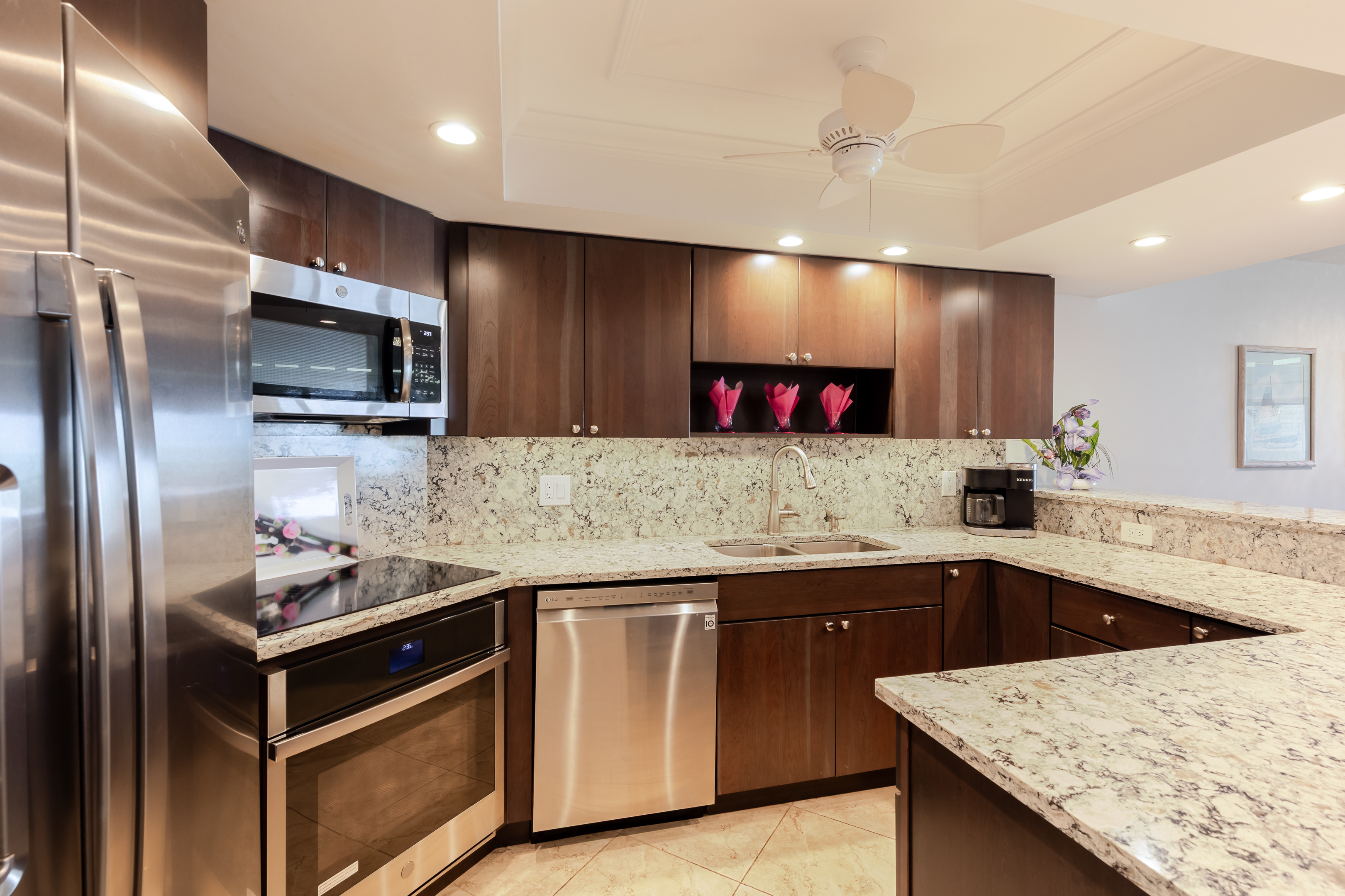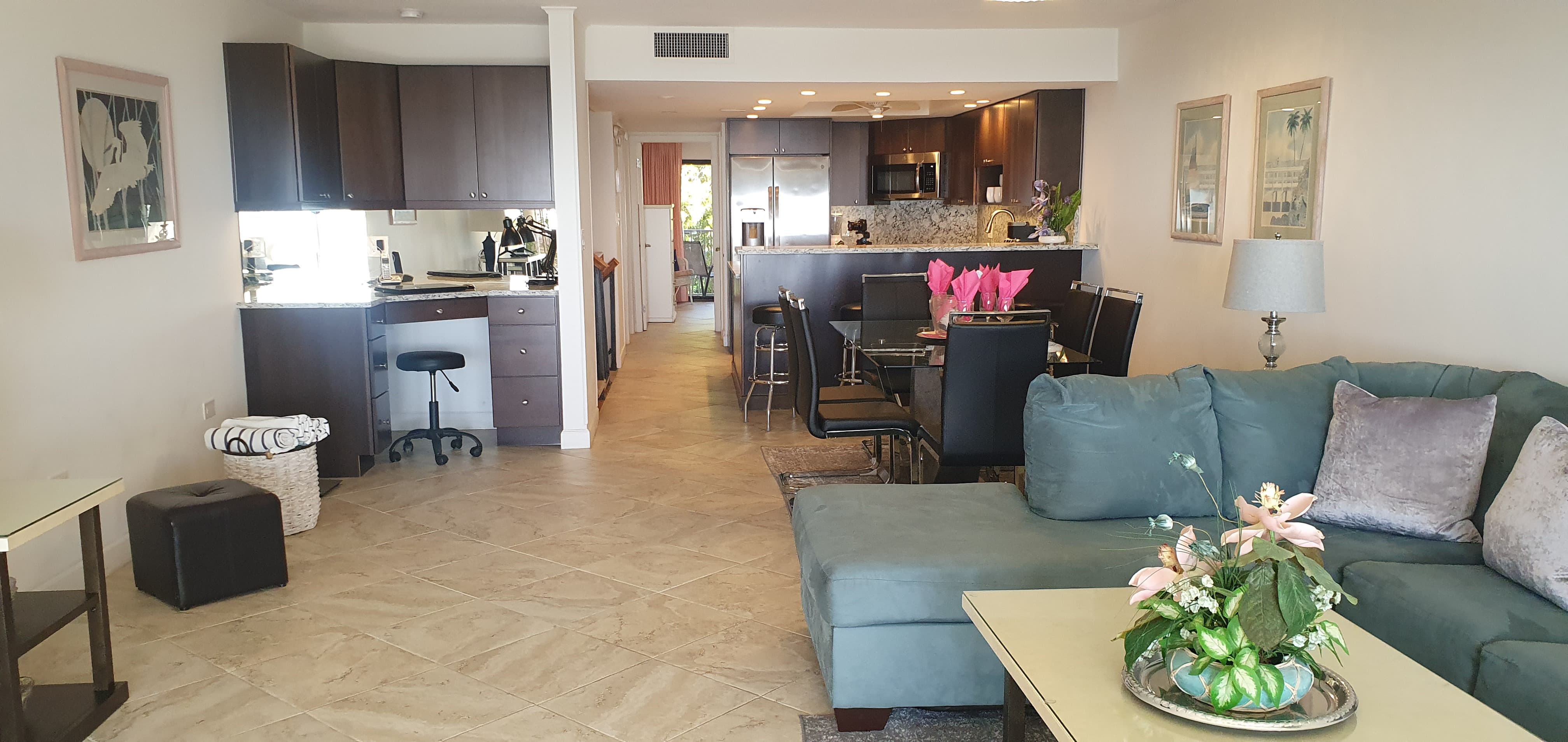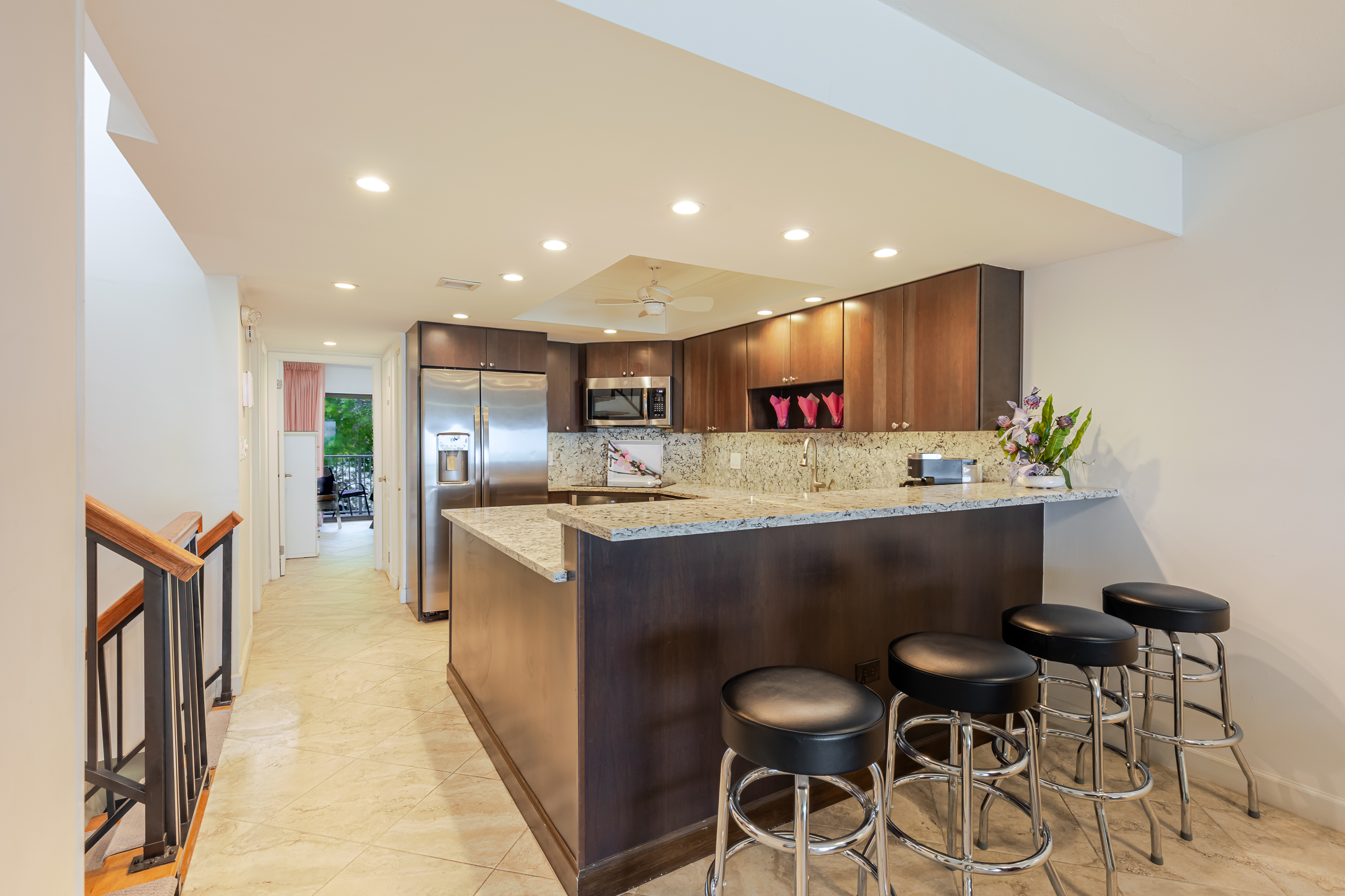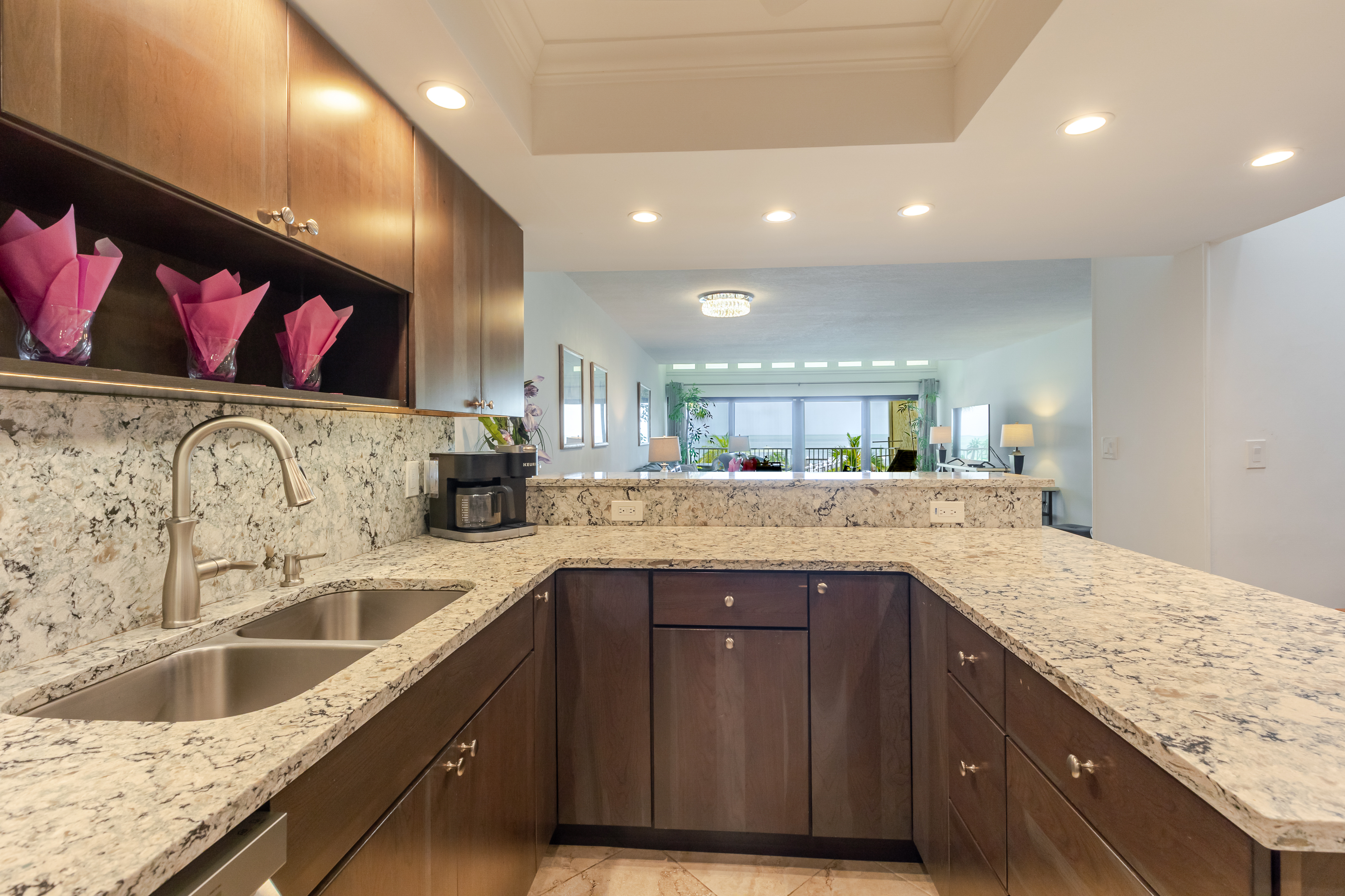 Modern Kitchen & Living Area: Enjoy a fully equipped, newly renovated kitchen and an expansive living and dining area on the first floor. Step out onto the waterside balcony to relish stunning sunsets and sweeping views of the pool area and the Atlantic Ocean.