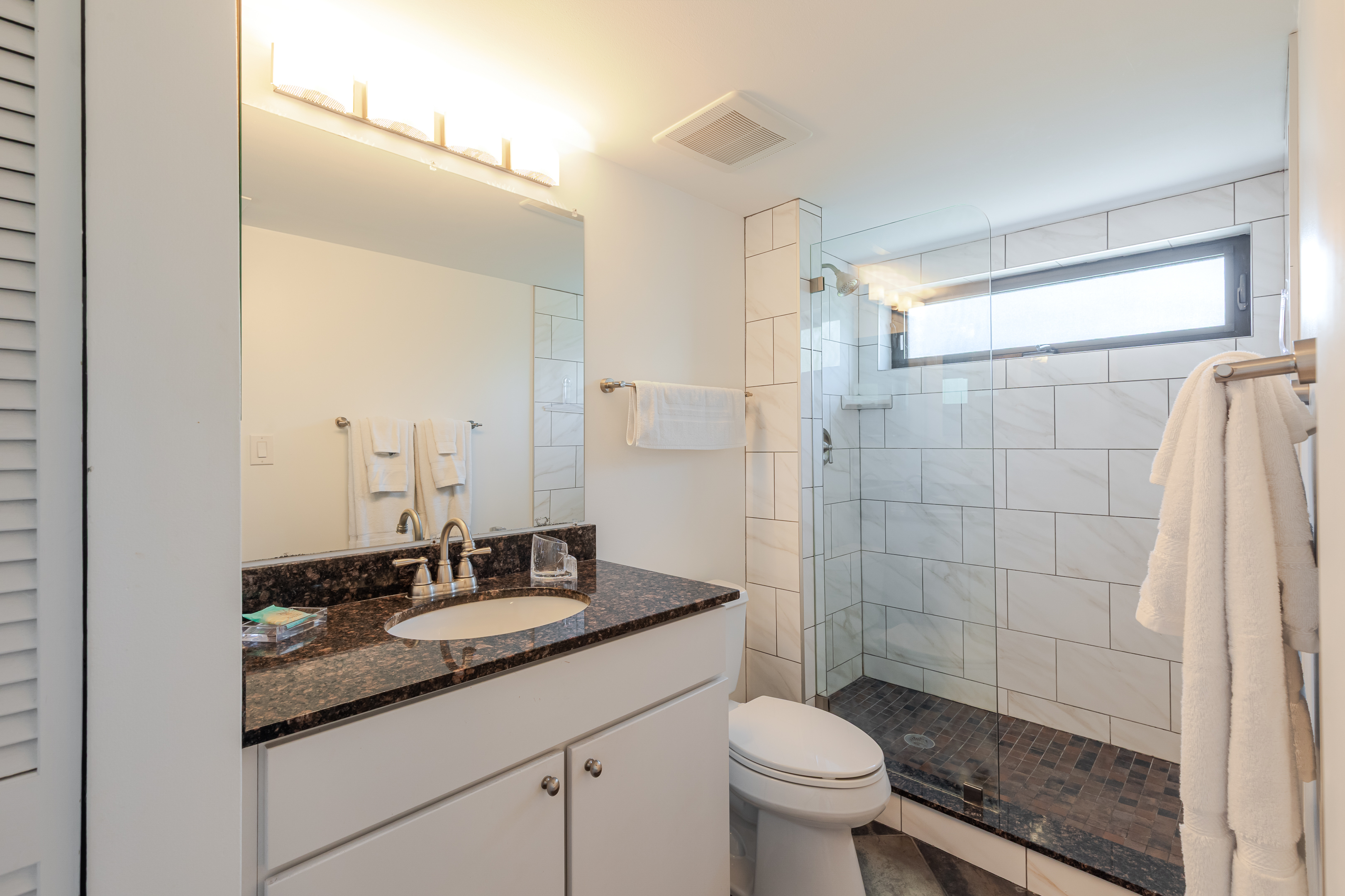 Guest Bedrooms: One guest room on the second floor with a TV and another on the first floor with access to the rear balcony.