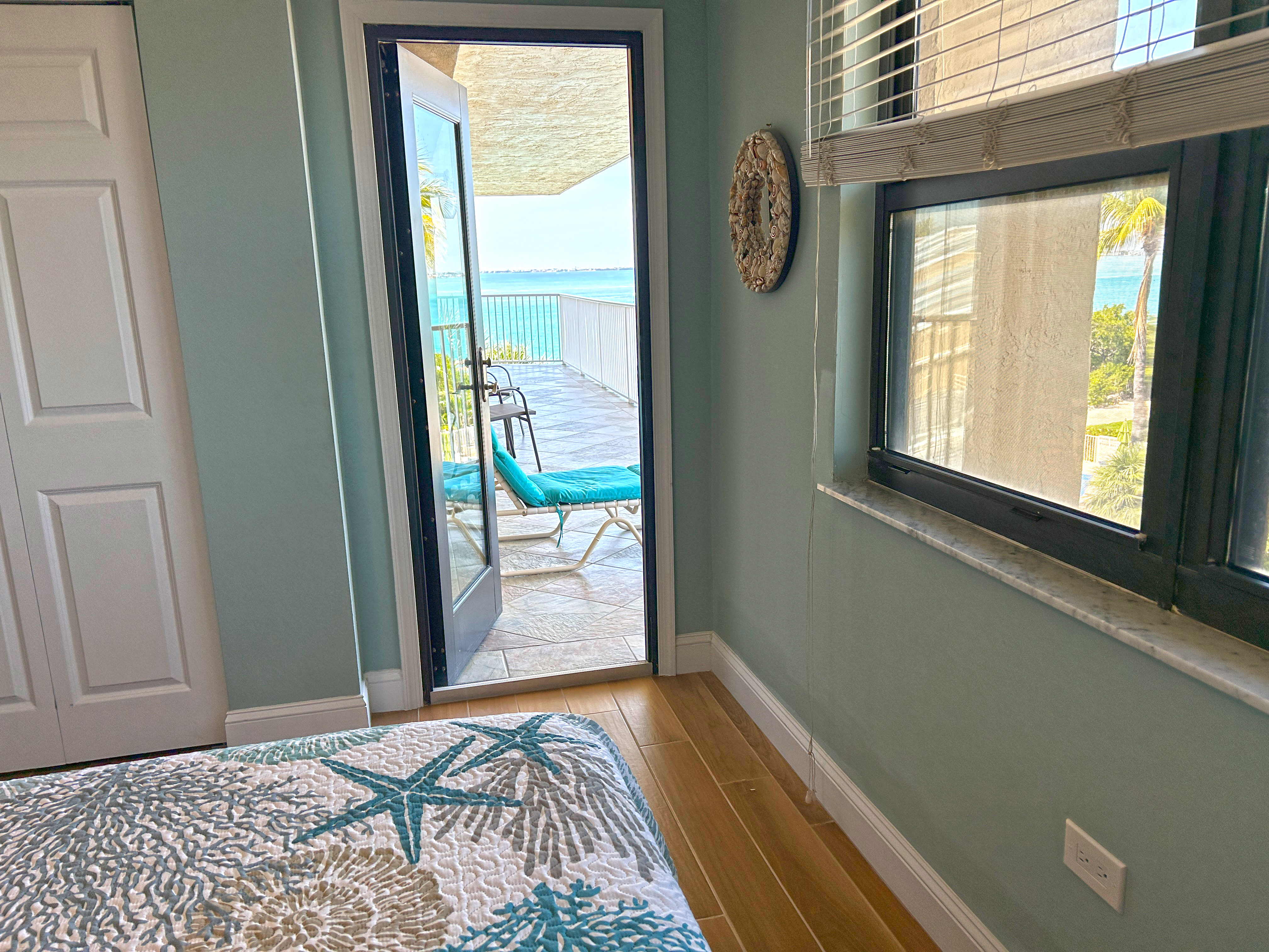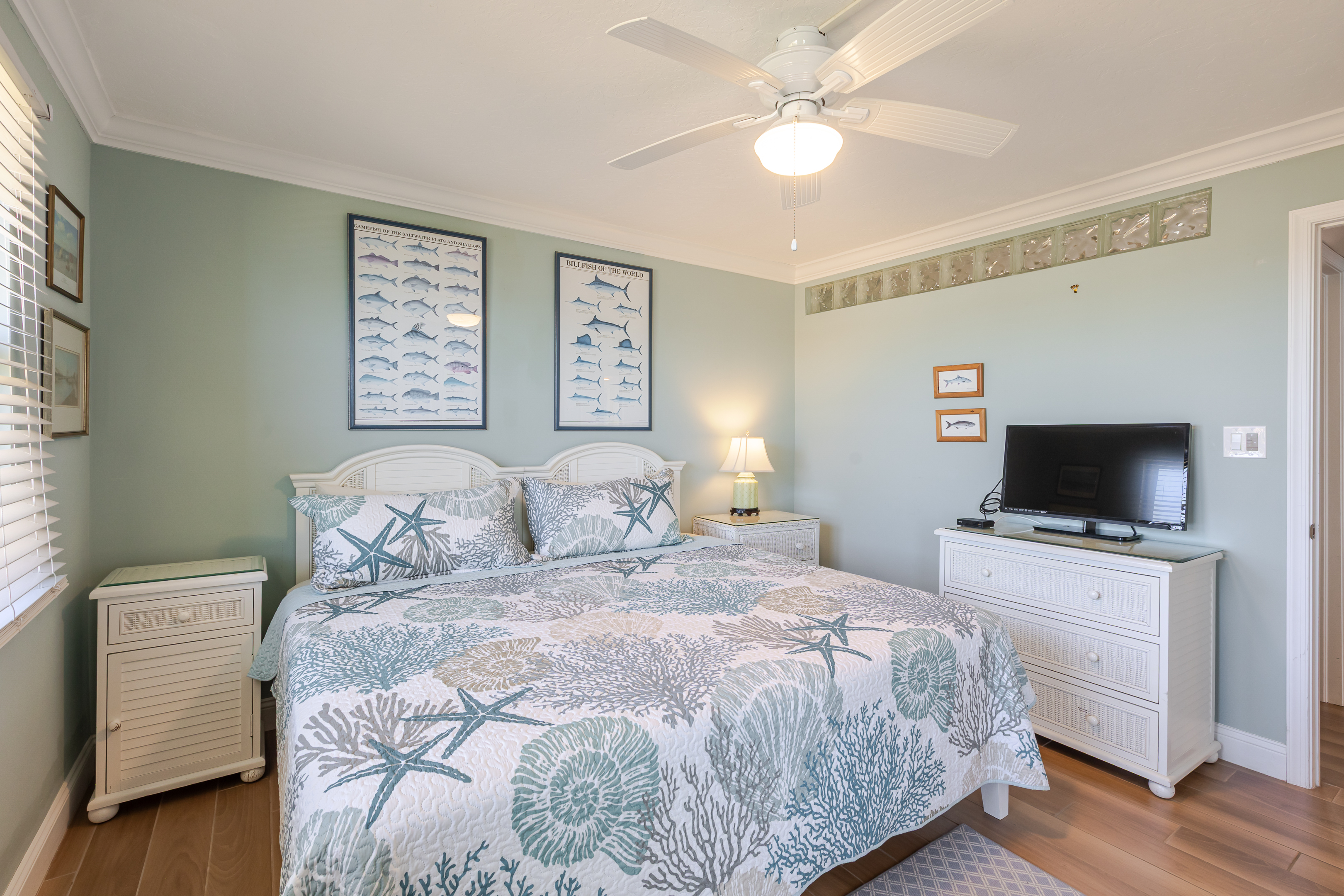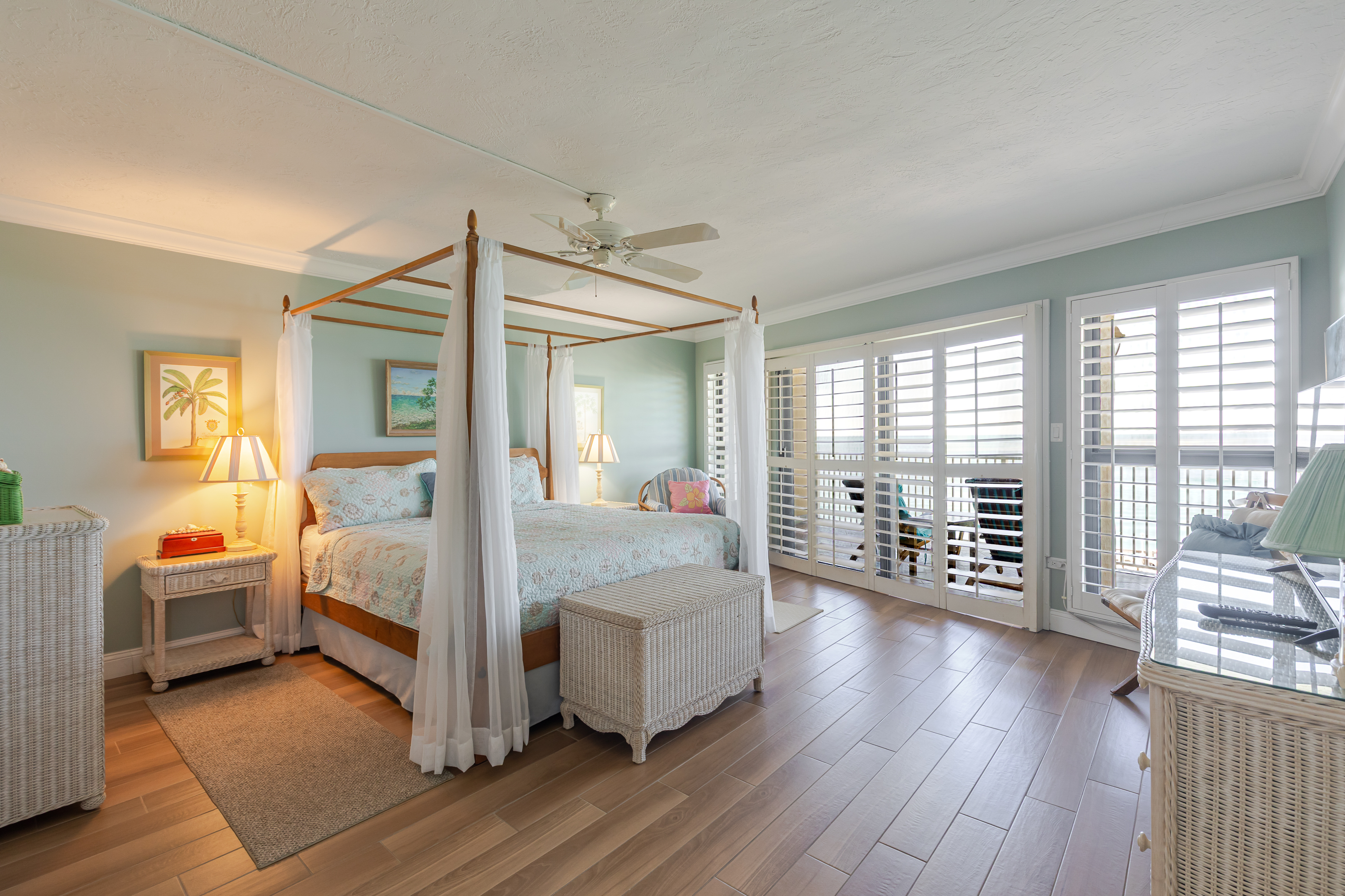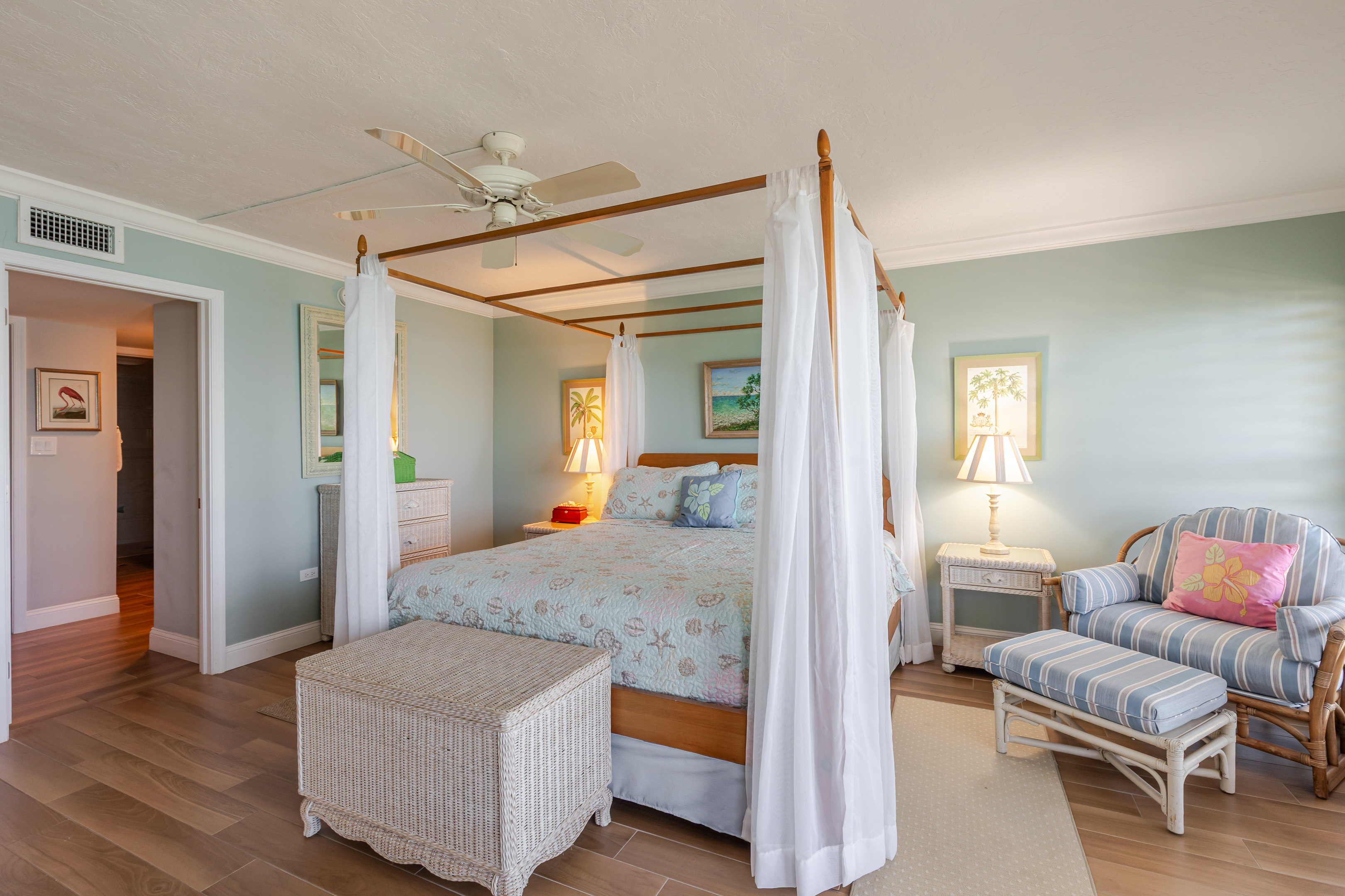 -Comfortable Bedrooms: The primary bedroom boasts a king-size bed, a dedicated workspace, and an ensuite bath with dual vanities and a walk-in shower. It also has a sliding glass door leading to the oceanfront balcony. The guest bedroom features a king size bed with close proximity to the full bath that is shared with den. Guest bedroom has private access to the wrap around balcony. The cozy den has one twin bed and an armoire.