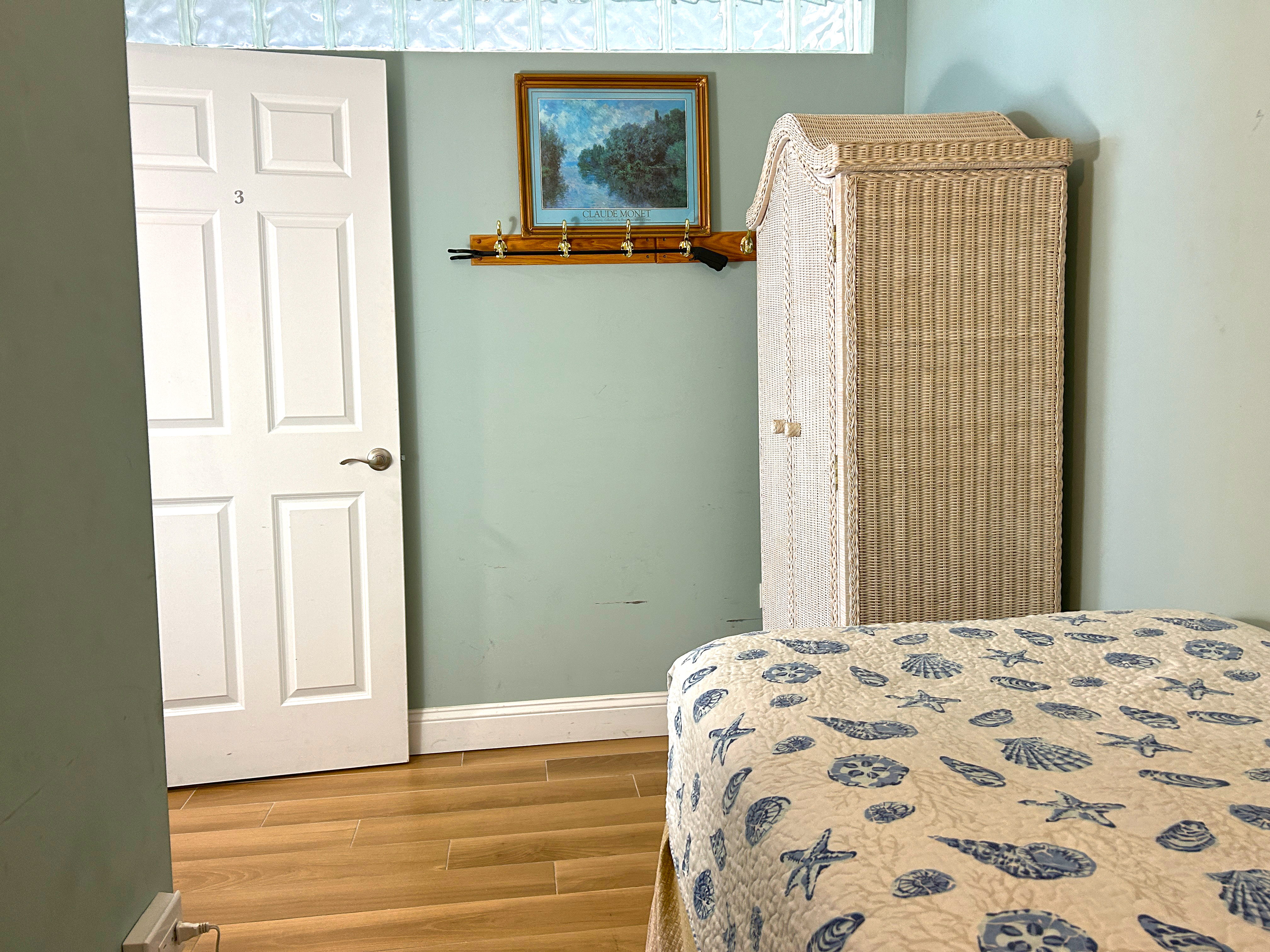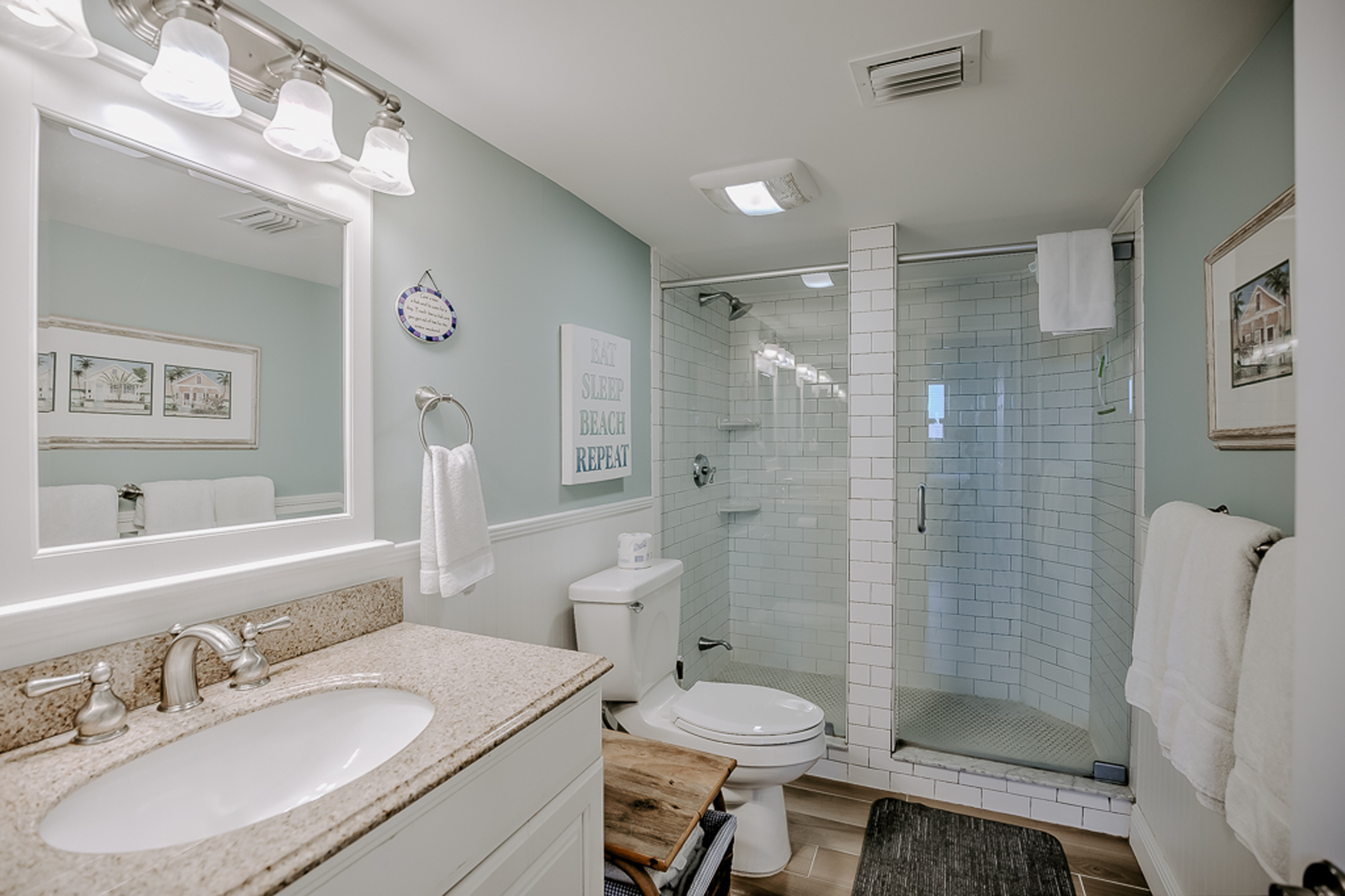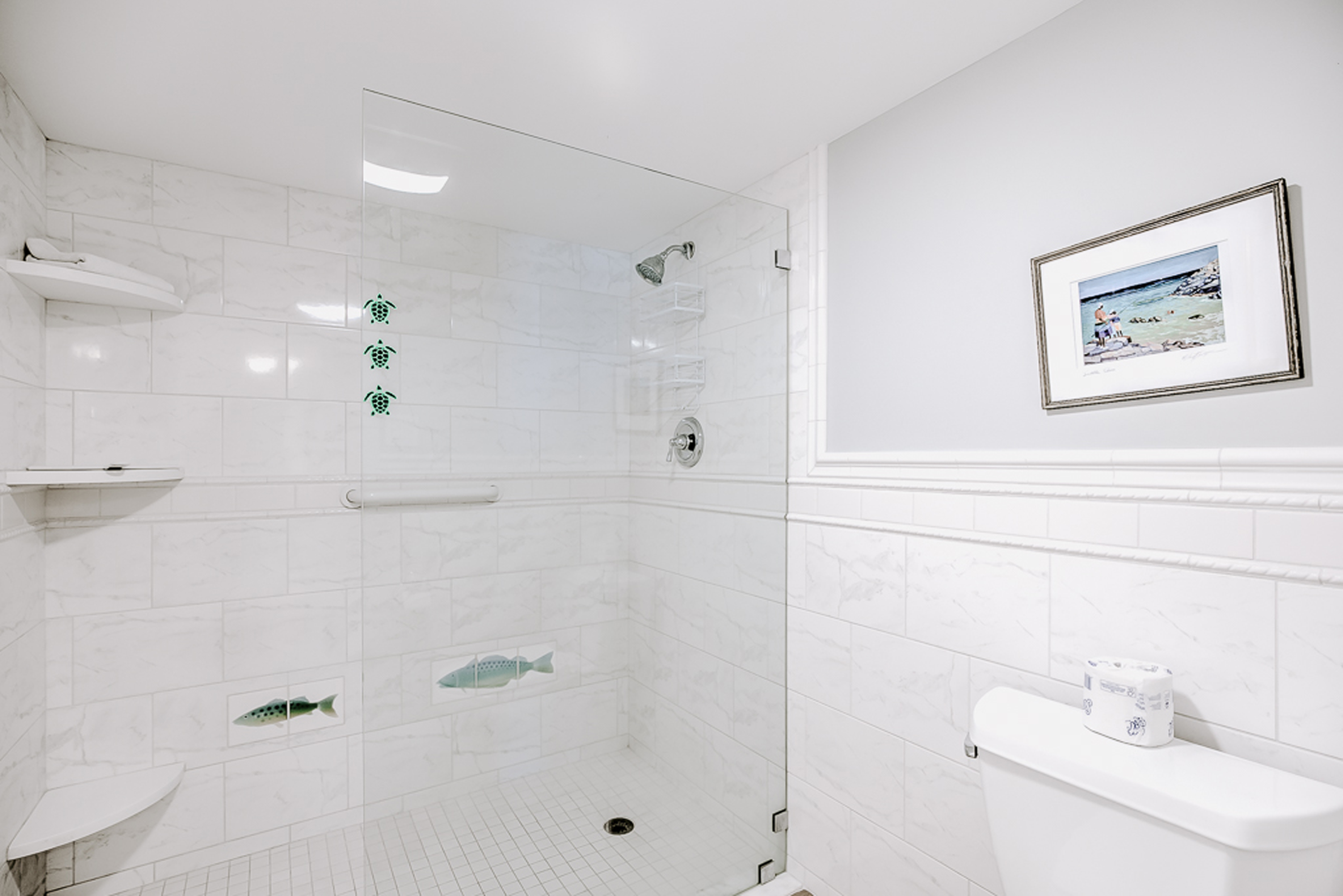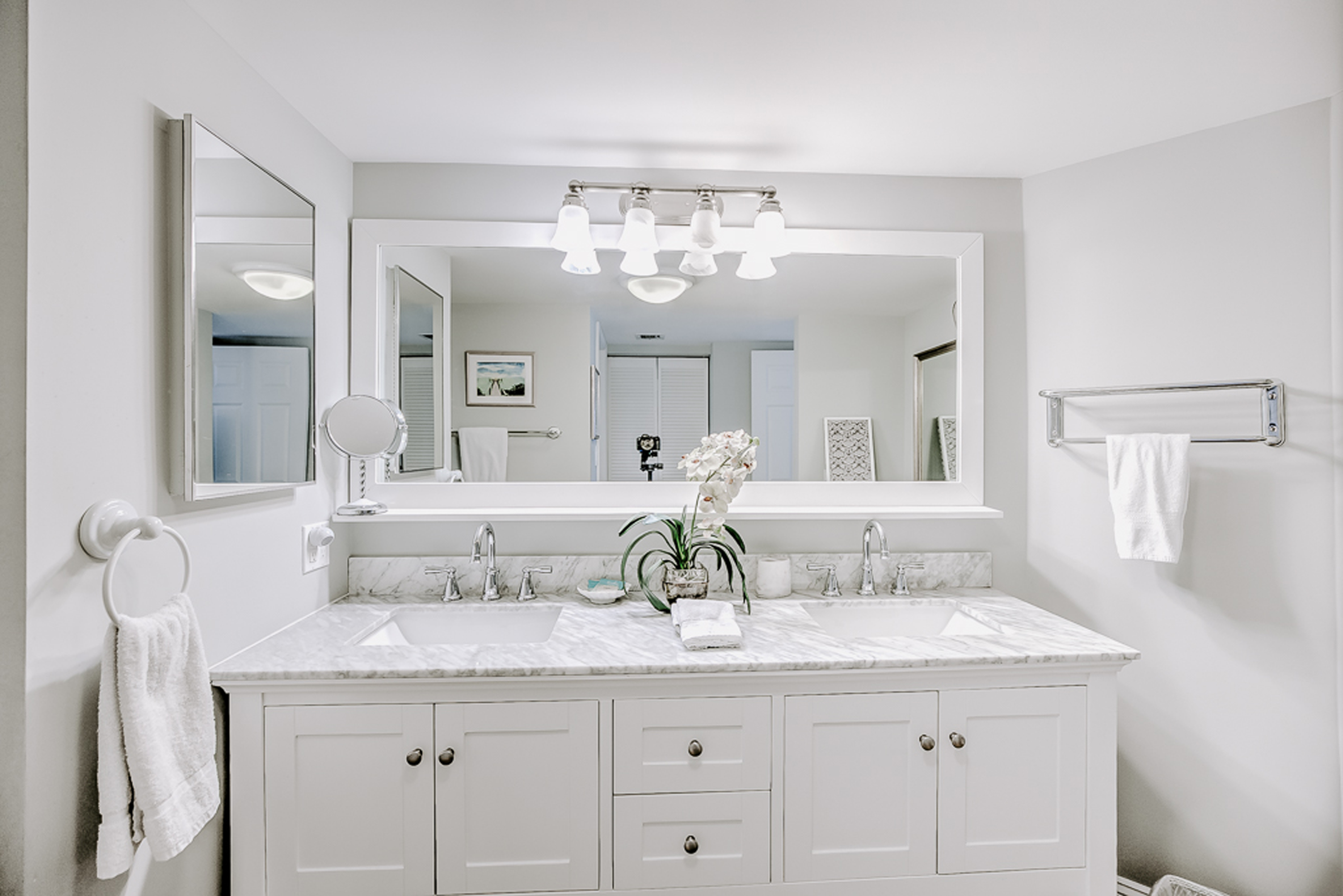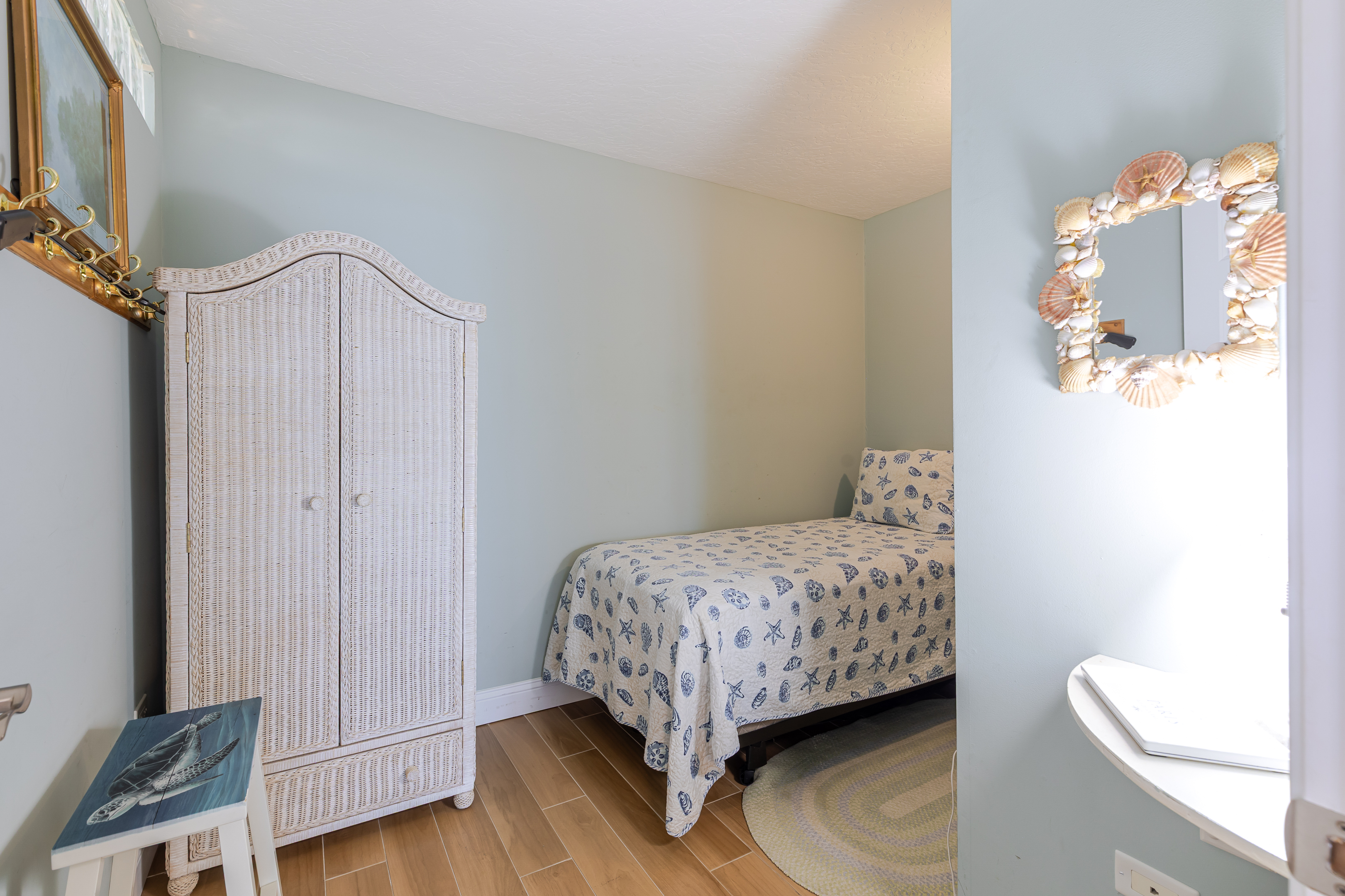 -Comfortable Bedrooms: The primary bedroom boasts a king-size bed, a dedicated workspace, and an ensuite bath with dual vanities and a walk-in shower. It also has a sliding glass door leading to the oceanfront balcony. The guest bedroom features a king size bed with close proximity to the full bath that is shared with den. Guest bedroom has private access to the wrap around balcony. The cozy den has one twin bed and an armoire.