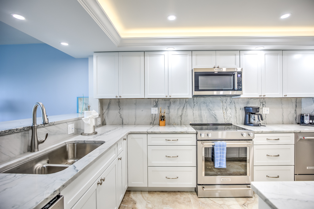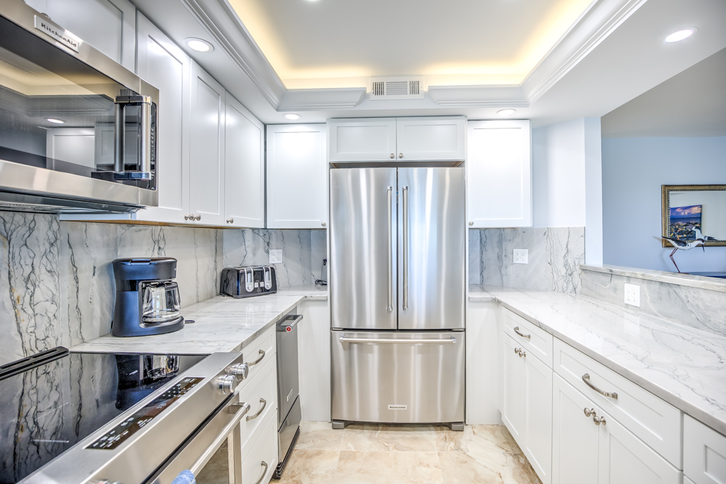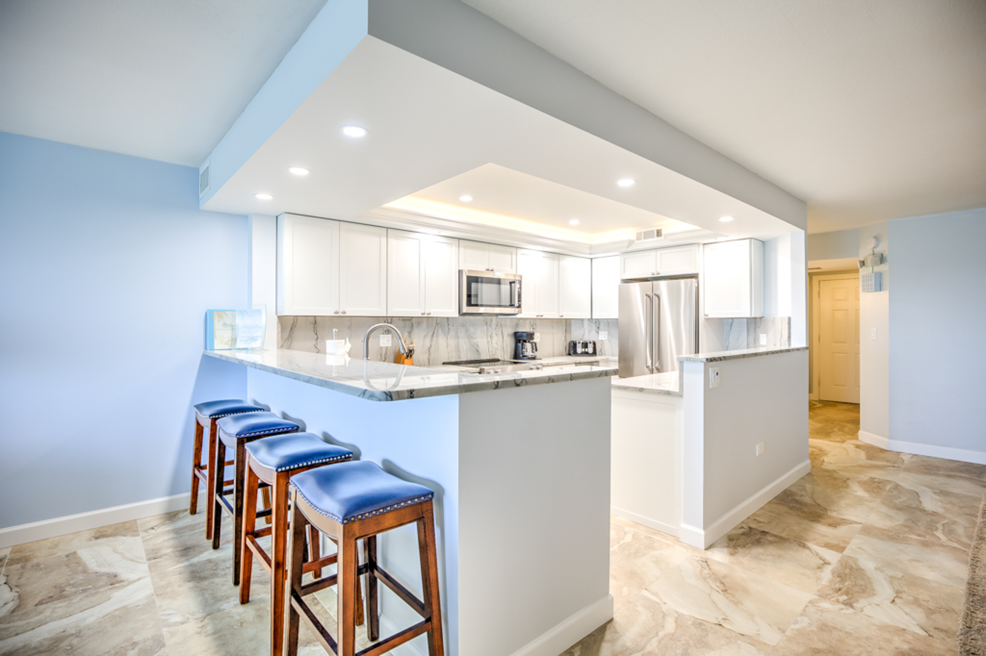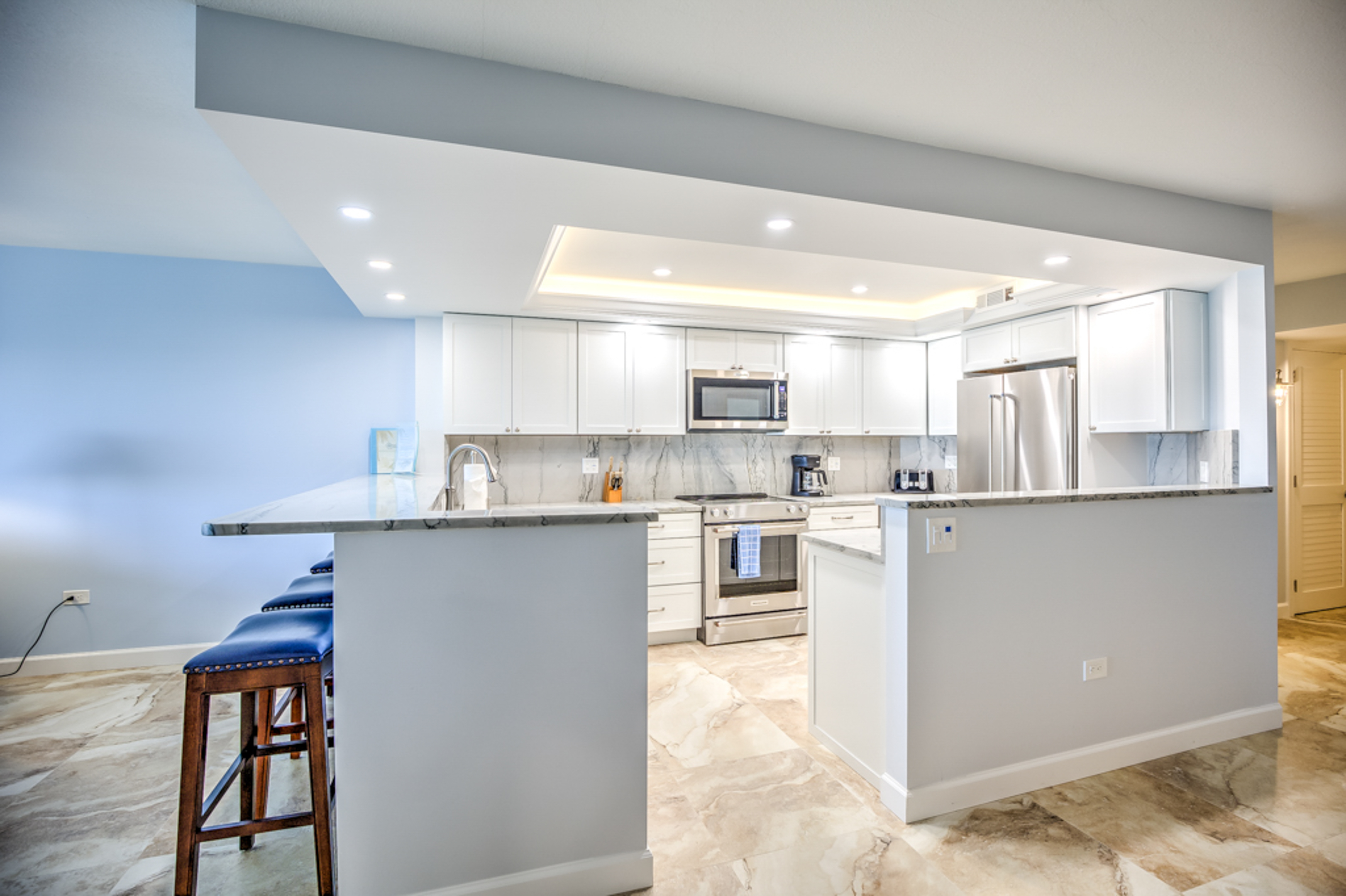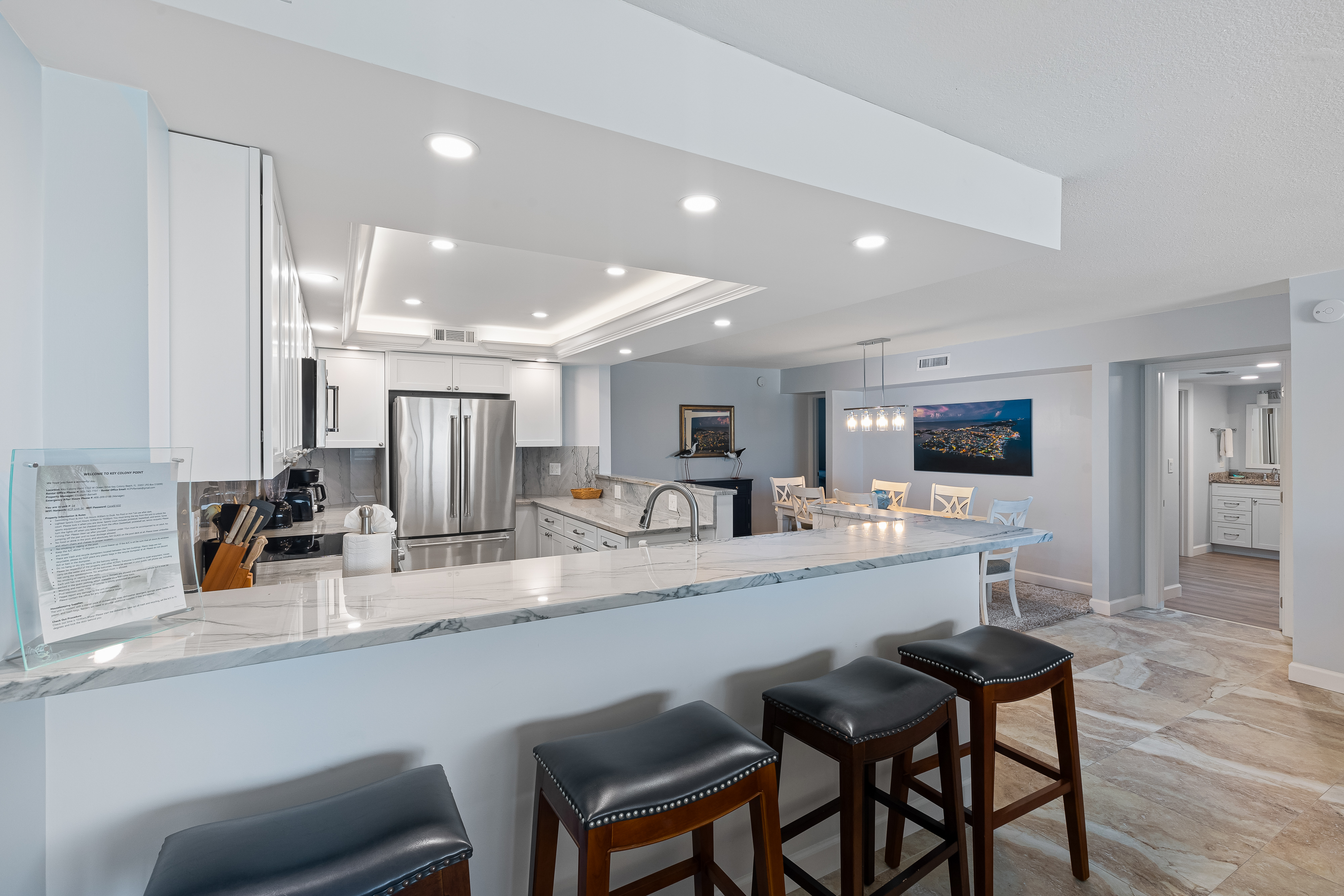 - Gourmet Kitchen: The heart of this condo is its show-stopping kitchen, featuring custom quartz countertops, a chic backsplash, high-end appliances, and an extra undercounter ice maker. The roomy breakfast bar and elegant dining area flow effortlessly into the spacious living room, creating a perfect space for entertaining or relaxing.