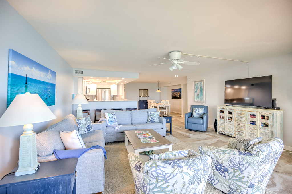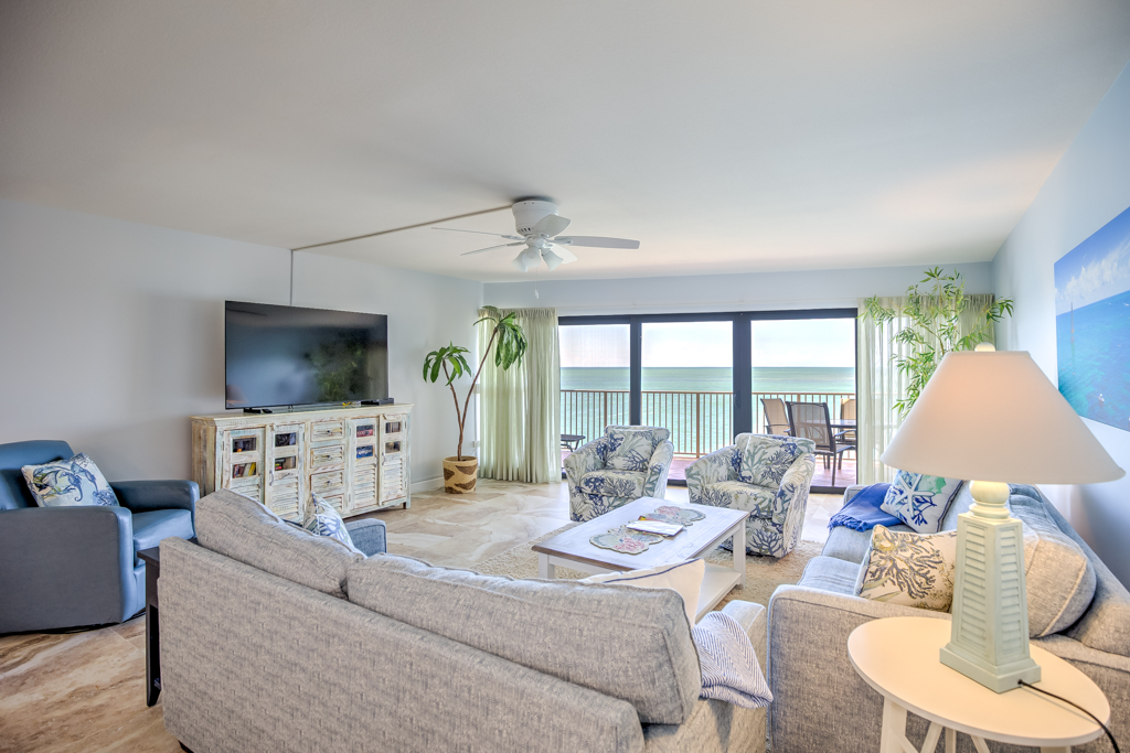 - Expansive Living Area: Bask in the huge open water views from the living room with two sleeper sofas, which opens to a spacious 300 sqft balcony. With ample seating and a serene ambiance, it's the ideal spot to watch boat traffic, marvel at the Marathon Lady, or simply enjoy a stunning sunset.
